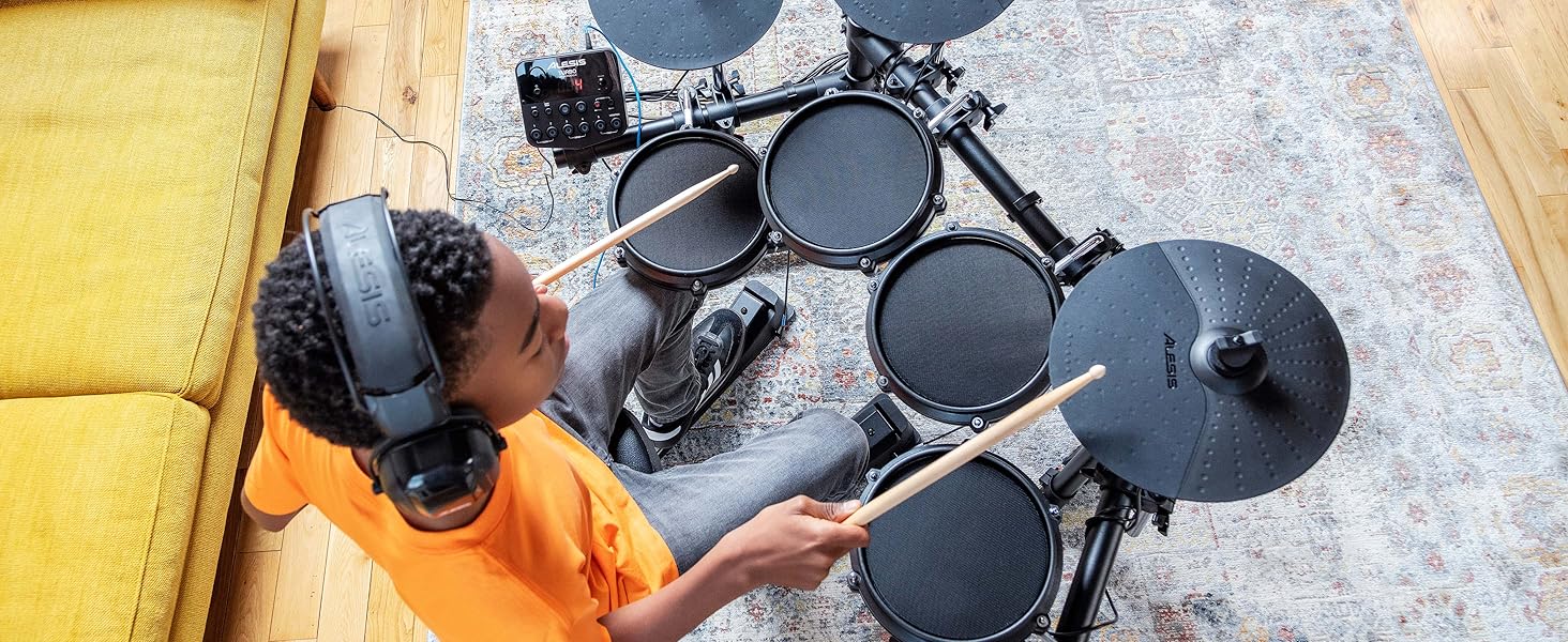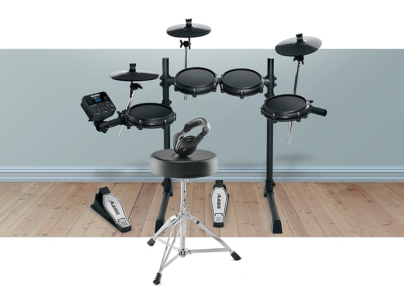 that modern drummers demand.Premium 7-Piece Drum Set - 8" Grid Drum with (3) 8" Grid Drum, (3) 10" Cymbals and Custom Designed Alesis Pedals Boards and SkirtsSounds Included - Turbo Drum module with 10 ready-made classic and modern drum kits, 30 playback tracks and over 100 professionally curated soundsPowerful educational features – 30 built-in play sequence tracks, metronome, aux input, and drum coach help hone and develop your drumming skillsEverything you need - including sturdy steel frame, connecting cables, drum sticks, drum keys and power supplyproduct descriptionAlesis Drum Turbo Mesh Kit - Everything You Need to Supercharge Your Electric Drum KitYour performance shouldn't be based on compromises - At Alesis, we know that modern drummers of all levels demand the ultimate authentic, natural response for an immersive, expressive drum experience. Introducing the Alesis Turbo Mesh kit, the newest addition to our roster of critically acclaimed full mesh electric drum kits, delivering the most realistic playing experience modern drummers demand. Perfect feel and true skin-like rebound, our exclusive mesh head is the undisputed preference of the modern drummer, delivering unrivaled natural feel and ultra-quiet response - perfect for late night practice sessions. The Turbo Mesh Kit is a turbo electronic drum module packed with on-demand electronic and acoustic drum kit sounds, ready-to-play kits, and built-in playback tracks. Don't settle for the second best, discover the new standard in electronic drums.Pro-Performance Mesh HeadTurbo Mesh kit comes with one 8" mesh snare drum and (3) 8" mesh drums, plus everything you need to make a complete drum kit - (3) 10" 25.4cm) cymbals, custom designed Alesis pedals and kick pedals and durable steel frame.Introducing the Alesis Drum Essentials Kit - Everything You Need to Get the Best From Your Electric Drum KitAdd the Alesis Drum Essentials kit to the Turbo Mesh kit, which provides an adjustable, double-supported drum throne, ensuring comfort and support for drummers of all ages. The throne folds down easily, making it perfect for storage or travel. Also included are premium headphones with an in-ear design that eliminates distractions so you can focus on what's important - playing!