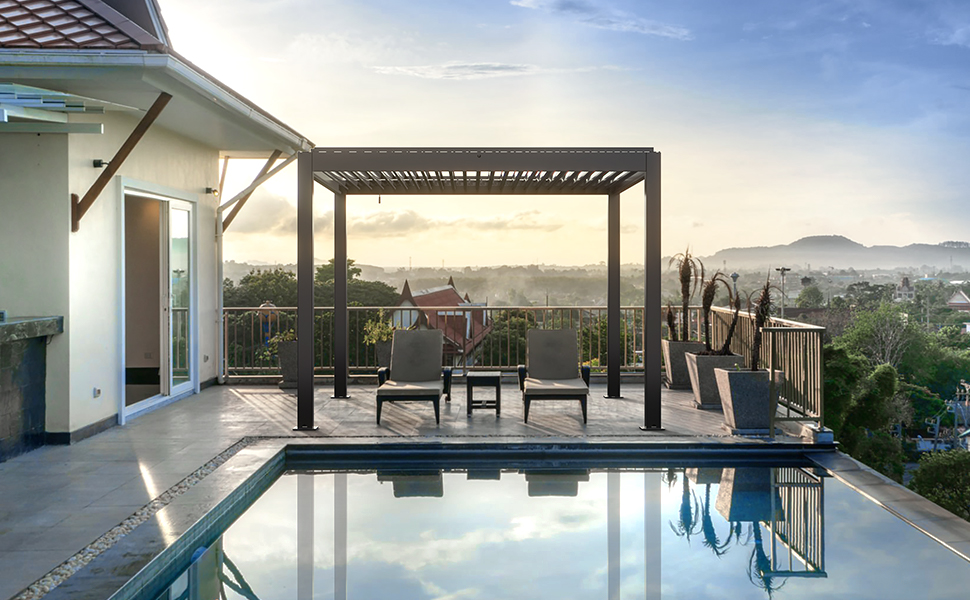 【Home&Garden】【BS】10'x10' NO Corrosion Louvered Pergola, High Strength Gazebo for Yard