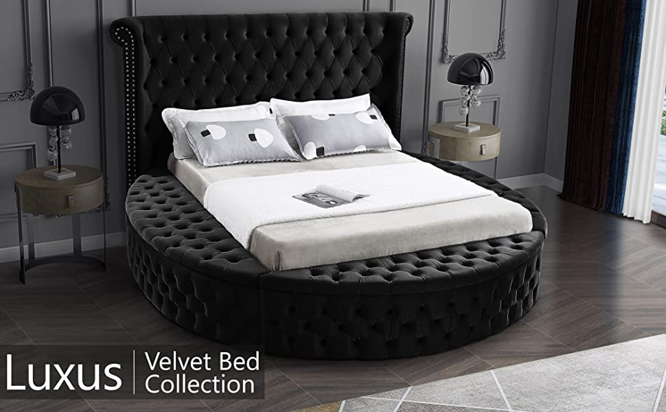 Marvel at the remarkable beauty and graceful lines of the round Luxus velvet bed collection. The headboard, footboard and, side rails are all adorned with deep button tufting, and as well as a nailhead trim on both sides of the tall headboard. The footboard and side rails all contain ample storage and seating, making it easy to sit down in comfort so you can put on your pants or shoes.